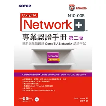 這本獲得CompTIA授權的最佳認證指南是您準備新版CompTIA Network+ N10-005認證的關鍵。本書第二版是依據最新Network+考試目標修訂的更新版本,內容提供所有通過測驗所須具備的相關知識,隨書的光碟中內含模擬考試、電子提示卡及專屬的Network+網路模擬器等。